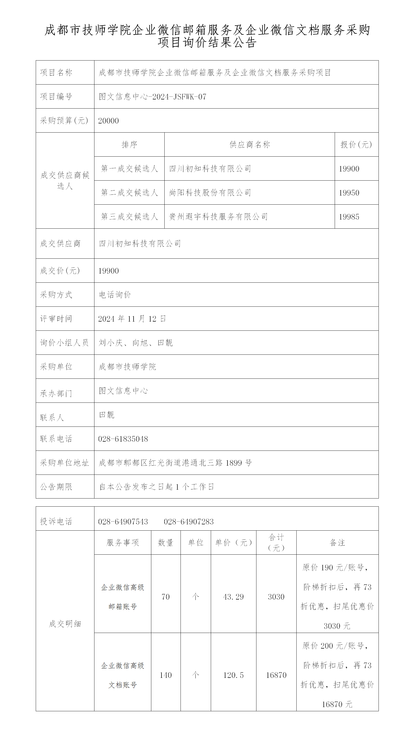 成都市技师学院企业微信邮箱服务及企业微信文档服务采购项目询价结果公告